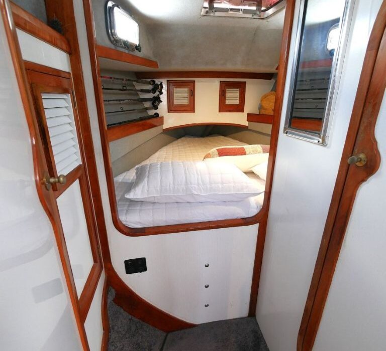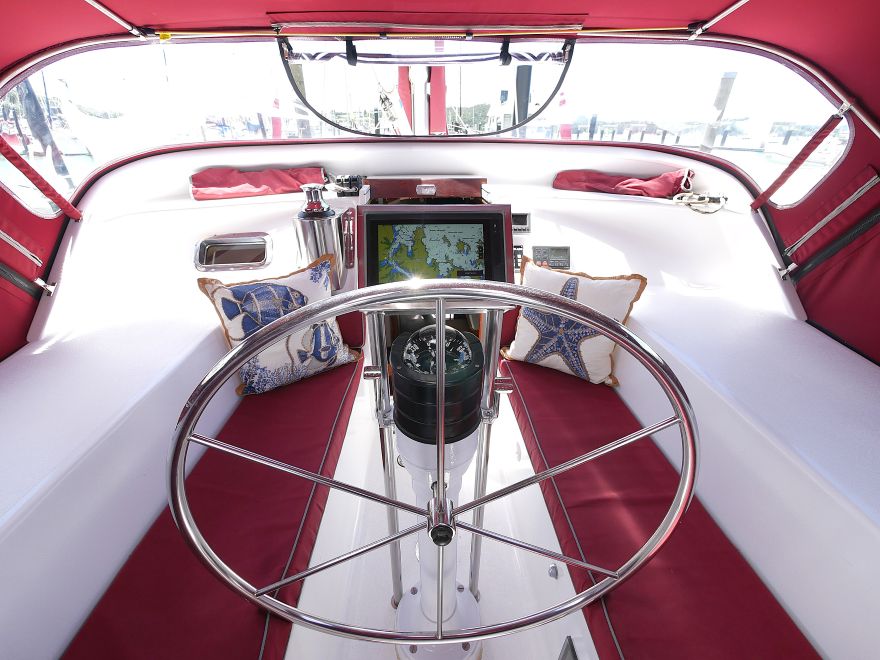 She’s also a serious offshore performer — easy to handle shorthanded with three furling sails and an electric halyard winch, well-balanced, and built to chew through miles offshore with confidence.