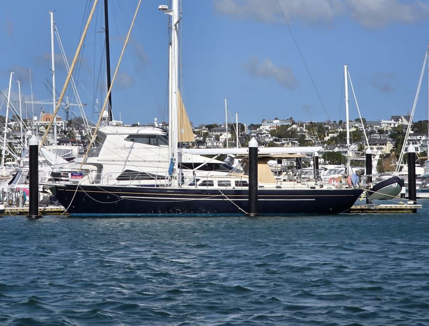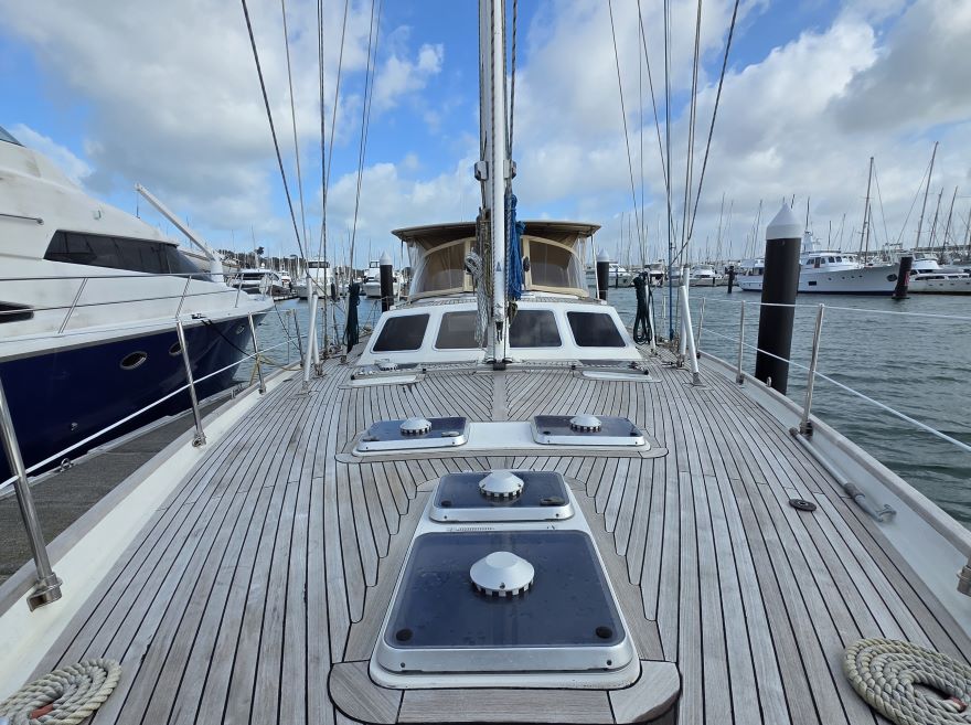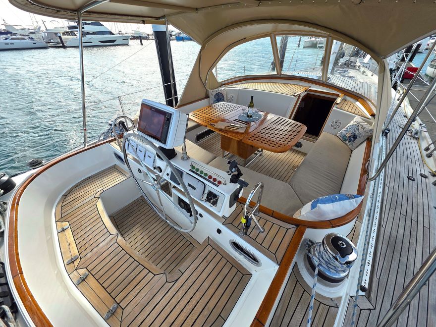 Her systems are engineered for effortless, push-button sailing, while below decks she offers marble benchtops, rich timber cabinetry, and a master stateroom that feels more boutique hotel than bluewater cruiser.